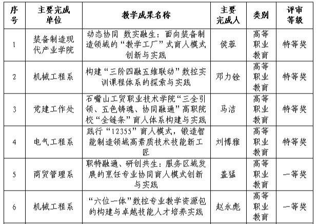 為進(jìn)一步推進(jìn)學(xué)院職業(yè)教育改革,提煉、總結(jié)一批具有創(chuàng)新性、實(shí)踐性和推廣應(yīng)用價(jià)值的教育教學(xué)成果,學(xué)院組織開展了2025年教學(xué)成果獎(jiǎng)評(píng)審工作,經(jīng)個(gè)人申報(bào)、各部門推薦、學(xué)院組織專家評(píng)選,共評(píng)選出2025年石嘴山工貿(mào)職業(yè)技術(shù)學(xué)院校級(jí)教學(xué)成果獎(jiǎng)15項(xiàng),其中特等獎(jiǎng)4項(xiàng),一等獎(jiǎng)5項(xiàng),二等獎(jiǎng)6項(xiàng),現(xiàn)將評(píng)選結(jié)果公示如下: