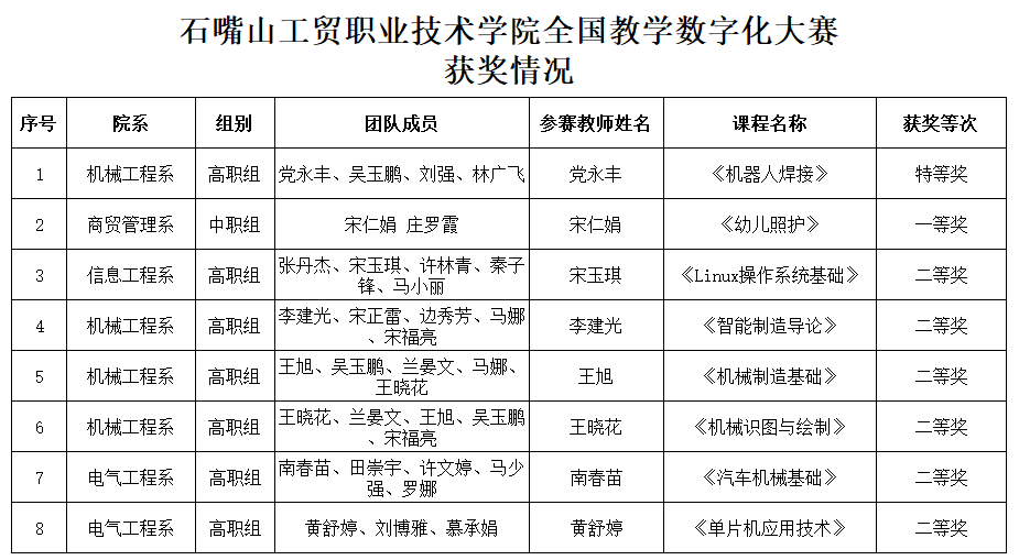學院選送的《幼兒照護》《Linux操作系統(tǒng)基礎》《智能制造導論》《機器人焊接》等8個團隊在大賽中分別獲得特等獎、一等獎、二等獎的好成績,學院榮獲“優(yōu)秀組織獎”。
