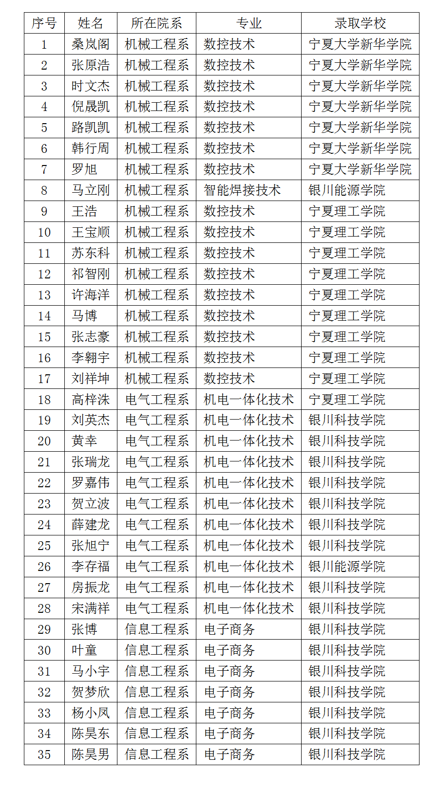 寧夏“專升本”錄取名單陸續(xù)公布,石嘴山工貿(mào)職業(yè)技術學院捷報頻傳。我校第一屆應屆畢業(yè)生105位同學參加考試,45人成功上線,上線率達42.8%。目前,已錄取35人。