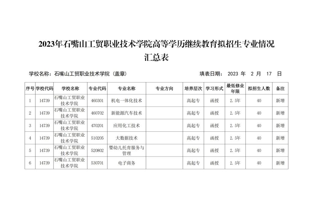 石嘴山工貿(mào)職業(yè)技術(shù)學(xué)院成人大專申辦備案在教育部高等繼續(xù)教育信息管理系統(tǒng)內(nèi)已審批通過。學(xué)院自2023年開始面向社會招收高等學(xué)歷繼續(xù)教育高起專層次生源。現(xiàn)將學(xué)院本年度第一批次擬開展招生的6個專業(yè)面向社會公示。具體專業(yè)情況如下: