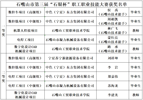 近日,在2025年石嘴山市第三屆“石銀杯”職業(yè)技能大賽中,石嘴山工貿(mào)職業(yè)技術(shù)學(xué)院機械工程系教師、畢業(yè)生共計10人憑借扎實的理論知識和和出色的專業(yè)技能,在數(shù)控車項目、數(shù)控銑項目、機器人焊接項目、電焊工項目、數(shù)字化設(shè)計CAD機械設(shè)計項目等比賽中脫穎而出,榮獲一二等獎的優(yōu)異成績。其中,侯禹、周裕凱、林廣飛、蒙紅亮、路承5人并被授予“石嘴山市技術(shù)能手”榮譽稱號!