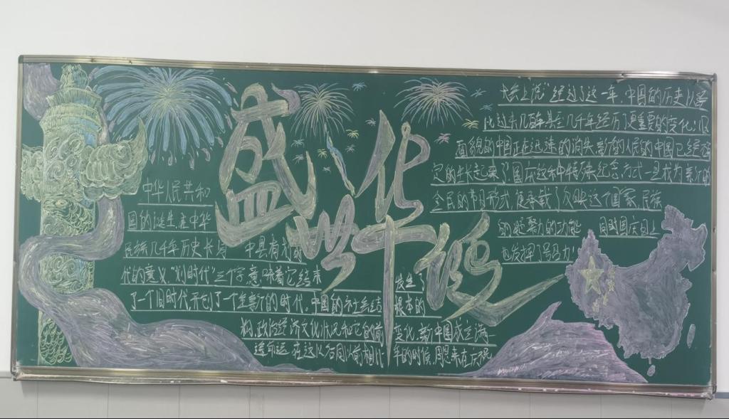 用愛繪制最美祖國。各班迅速行動起來,充分發(fā)揮個人特長,結(jié)合集體智慧,利用課余時間認真設(shè)計、安排,創(chuàng)作出一塊塊主題鮮明、設(shè)計美觀、圖文并茂、書寫工整的黑板報。雖然電氣工程系絕大多數(shù)都是男生,并不擅長繪制黑板報,但是他們依舊通過手中的粉筆,用愛、用心描繪出對偉大祖國濃濃的愛。