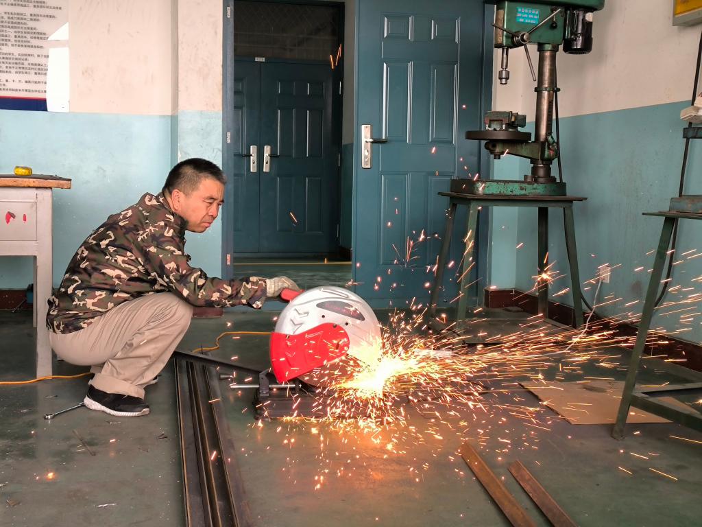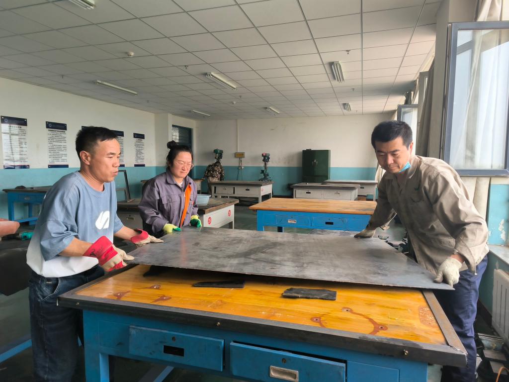 在鉗工實訓室改造現(xiàn)場,黨員們身著工裝,手持工具,各司其職,一派繁忙景象。劉佳將角鐵焊接在一起,火花四濺中,角鐵被焊接成型,完美的包裹住了已經(jīng)松散的桌角。蘇成軍運用切割機對角鐵部件進行了精準切割。每一次操作都準確無誤,既體現(xiàn)了黨員們高超的技能水平,也展示了他們嚴謹?shù)墓ぷ鲬B(tài)度。