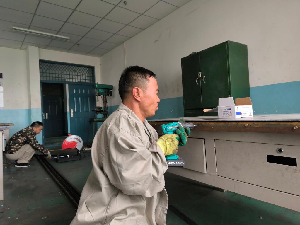 此外,幾位女同志也不甘示弱。慕承娟拆卸臺虎鉗,將卸下的螺絲釘和螺帽歸類放好,將一臺臺臺虎鉗搬運至實訓室墻角。鐘美用電動螺絲刀把螺絲釘釘進鋼條中,將角鐵與工作臺組裝到一起,提升了工作臺的牢固程度。此外,他們還對角鐵進行測量劃線,將實訓室的衛(wèi)生清掃干凈。