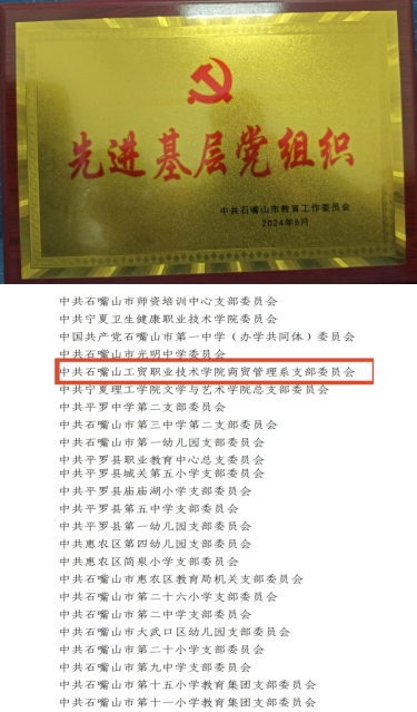 今年是中國共產(chǎn)黨成立103周年,中華人民共和國成立75周年。2024年7月9日石嘴山市教育黨工委決定表彰一批優(yōu)秀共產(chǎn)黨員、優(yōu)秀黨務工作者和先進基層黨組織,石嘴山工貿職業(yè)技術學院商貿管理系支部委員會榮獲“先進基層黨組織”榮譽稱號。