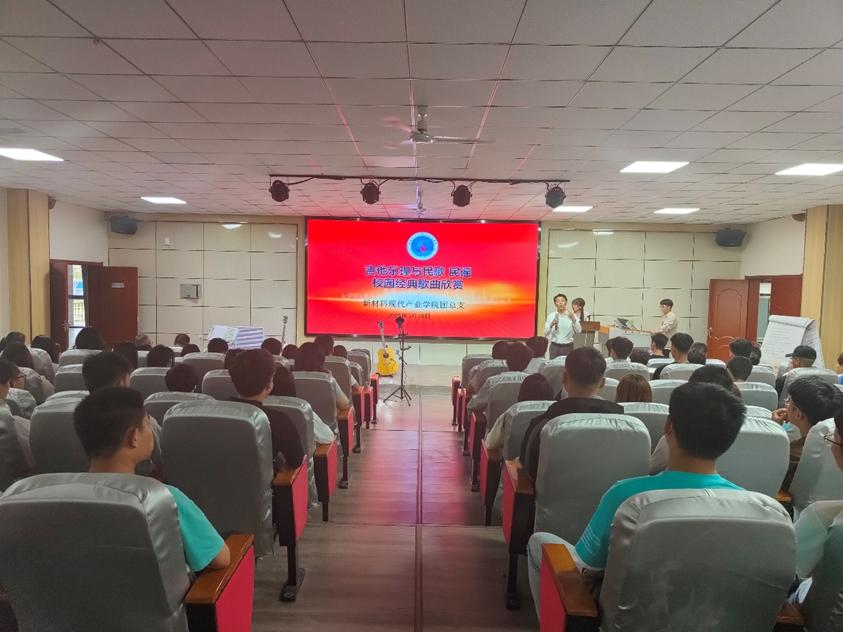 為進(jìn)一步貫徹落實(shí)習(xí)近平新時(shí)代中國(guó)特色社會(huì)主義思想,弘揚(yáng)愛國(guó)主旋律,激發(fā)全體師生的愛國(guó)熱情,增強(qiáng)愛國(guó)情感、陶冶愛國(guó)情操,促進(jìn)校園文化建設(shè),新型材料現(xiàn)代產(chǎn)業(yè)學(xué)院團(tuán)總支于5月18晚上在3號(hào)樓報(bào)告廳組織開展了吉他樂理與民歌、民謠校園經(jīng)典歌曲欣賞活動(dòng)。