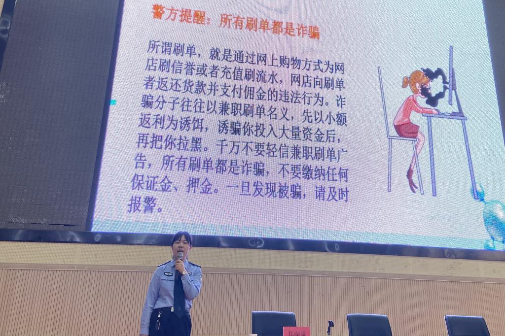 隆湖派出所干警馬潤(rùn)露結(jié)合多年工作經(jīng)驗(yàn),用近些年的典型詐騙案例向同學(xué)們闡述了什么是電信網(wǎng)絡(luò)詐騙、電信網(wǎng)絡(luò)詐騙的特點(diǎn)以及多種防范電信網(wǎng)絡(luò)詐騙的措施。重點(diǎn)從網(wǎng)絡(luò)刷單、網(wǎng)絡(luò)點(diǎn)贊、網(wǎng)絡(luò)游戲充值等方面揭露騙子的伎倆和手段,倡導(dǎo)廣大師生及時(shí)安裝利用好國(guó)家反詐APP,提高警惕防范一切網(wǎng)絡(luò)電信詐騙。此外,在大會(huì)過程中隆湖所的干警同志們通過發(fā)傳單的方式進(jìn)一步向師生宣傳如何防范電信網(wǎng)絡(luò)詐騙。最后,學(xué)院副院長(zhǎng)鄒韌呼吁廣大師生要積極增強(qiáng)個(gè)人保護(hù)意識(shí),不再使用的銀行卡和電話卡,及時(shí)進(jìn)行注銷。發(fā)現(xiàn)有收售銀行卡和電話卡的人員,及時(shí)向?qū)W院安全保衛(wèi)處或公安機(jī)關(guān)進(jìn)行舉報(bào)。希望全院師生緊繃防范之弦,遠(yuǎn)離詐騙之害。