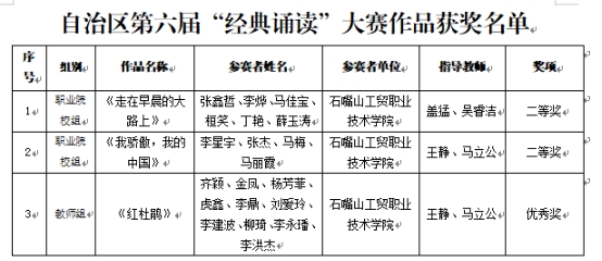 該活動自4月份啟動初賽以來,由學院圖書館牽頭,各院系配合周密部署,組織了多樣化的初選活動,教師從誦讀主題、內(nèi)容以及誦讀技巧、語言等方面進行指導,經(jīng)過層層選拔,最終選報朗誦作品4件、詩詞講解作品1件,其中學生組《我驕傲,我的中國》《走在早晨的大路上》榮獲全區(qū)二等獎、教師組《紅杜鵑》榮獲優(yōu)秀獎。