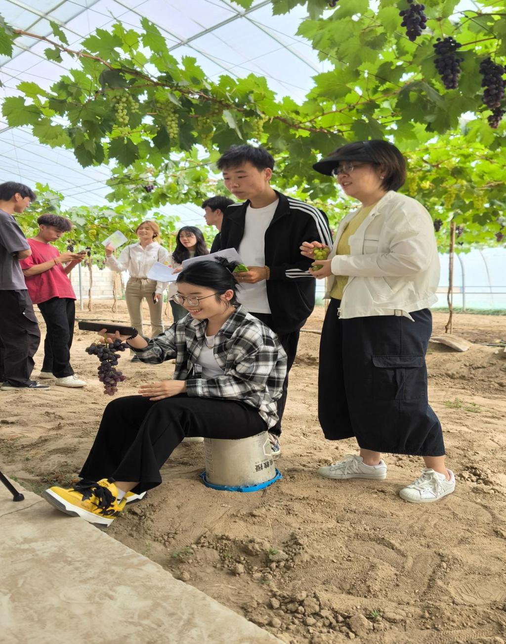 活動當天,志愿者們先后參觀了祥河幸福采摘園、華潤菌菇種植園區(qū)及高標準農田等現(xiàn)代農業(yè)示范點。在采摘園內,陽光玫瑰、黑美人、玉波二號等葡萄品種掛滿枝頭,小蘭西瓜也長勢喜人,學生們在農業(yè)技術員的講解下,聆聽了果蔬的科學管理方法。在華潤菌菇種植園區(qū),七河三號與七河九號香菇品種吸引了大家的目光,技術員詳細講解了食用菌的培育技術和生長環(huán)境要求。觀摩結束后,電子商務專業(yè)教師孫夢穎帶領電商專業(yè)學生化身“帶貨主播”,開展直播助農實踐。通過直播平臺,電商師生不僅展示了祥河村的優(yōu)質農產品,還宣傳了現(xiàn)代農業(yè)科技與生態(tài)理念。