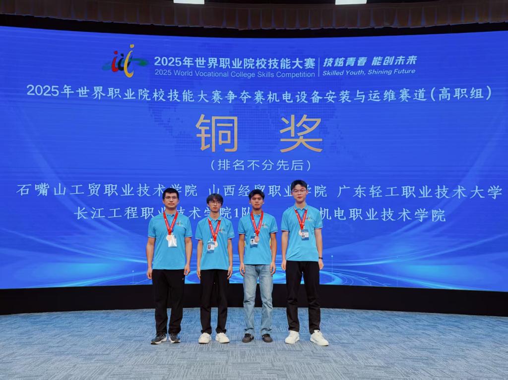 2025年9月22日,世界職業(yè)院校技能大賽爭奪賽機電設(shè)備安裝與運維賽道在天津機電職業(yè)技術(shù)學(xué)院圓滿落幕。經(jīng)過4天的激烈角逐,電氣工程系侯穩(wěn)展、馬文、吳曉兵、楊德榮軒4名同學(xué)組成的參賽隊伍,憑借扎實的專業(yè)技能、默契的團隊協(xié)作與穩(wěn)定的臨場發(fā)揮,從全國90支參賽隊伍中脫穎而出,斬獲團體賽銅牌(三等獎),這也是石嘴山工貿(mào)職業(yè)技術(shù)學(xué)院首次在該賽道上獲得國家級榮譽。