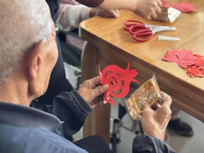 活動(dòng)的另一大亮點(diǎn)是學(xué)院龔麗娟老師帶去的剪紙互動(dòng)環(huán)節(jié)。龔老師攜手志愿者們現(xiàn)場(chǎng)教學(xué),與托養(yǎng)服務(wù)中心的殘疾人及老人們一同剪制象征“團(tuán)結(jié)、和諧、多子多福”的石榴圖案,一張張紅紙?jiān)谑种蟹D(zhuǎn)、裁剪,不一會(huì)兒,一幅幅生動(dòng)精美的石榴剪紙作品便呈現(xiàn)出來(lái)。剪紙活動(dòng)不僅讓大家體驗(yàn)了中華傳統(tǒng)文化的魅力,更通過(guò)“石榴”的美好寓意,寄托了對(duì)民族團(tuán)結(jié)、社會(huì)和諧以及生活美滿的誠(chéng)摯祝福。