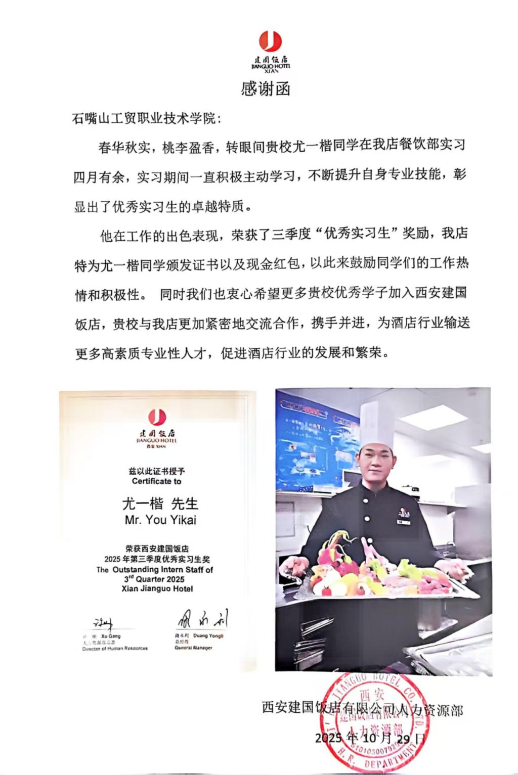 校企共育結(jié)碩果 實(shí)習(xí)榮光綻芳華 | 西安建國(guó)飯店專函致賀石嘴山工貿(mào)職業(yè)技術(shù)學(xué)院學(xué)子尤一楷獲授“優(yōu)秀實(shí)習(xí)生”稱號(hào)