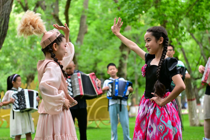 在新疆塔城市文化廣場,練習(xí)手風(fēng)琴的孩子隨著琴聲翩翩起舞(2024年7月24日攝)。