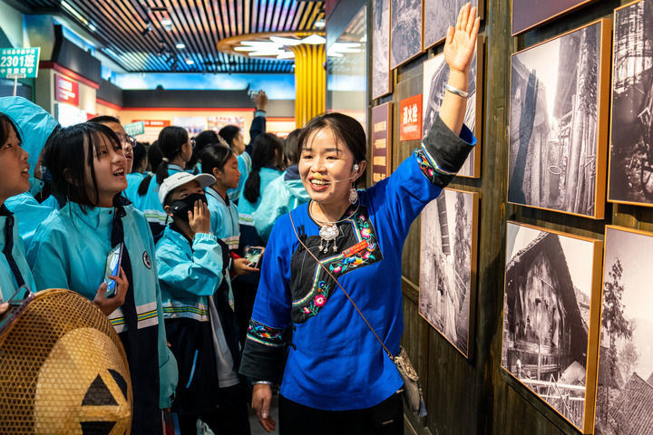 在湖南湘西十八洞村,講解員施艷琴為游客講解十八洞村的故事(2023年11月1日攝)。